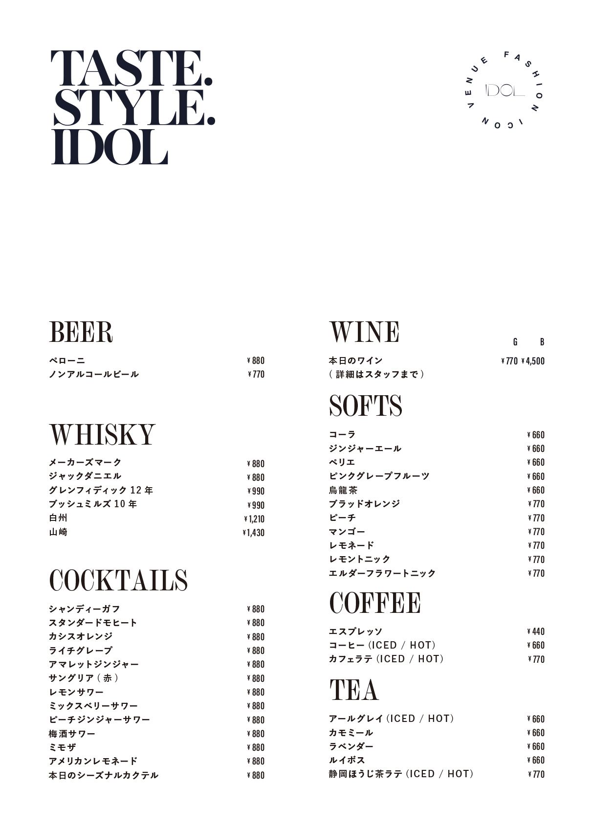 ワイン以外もカクテル、ビール、ハイボール、ウイスキー、ソフトドリンクなど種類豊富にご用意しております!